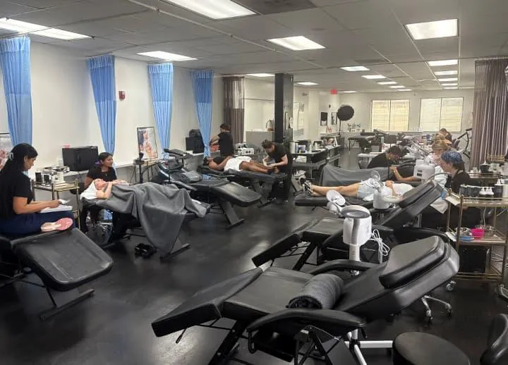 Hybrid Learning Model - All your theory—skin anatomy, sanitation standards, product chemistry, Florida regulations, state board prep—happens online through our eLearning platform. Study at home, at a coffee shop, or during your break at work. When you come to campus, you skip the lectures and dive straight into hands-on work: performing facials, waxing, makeup application, and lash treatments on real clients under instructor supervision.